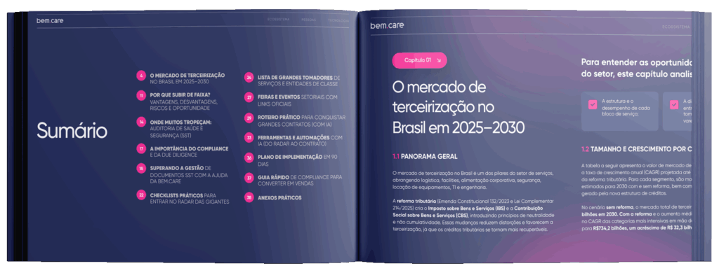 Vencer contratos com grandes corporações exige um ecossistema de confiança. Este ebook detalha o caminho exato para você subir de faixa no mercado de terceirização entre 2025 e 2030. Explore estratégias de Due Diligence, domine a gestão de documentos com suporte da IA e saiba como a bem.care ajuda sua empresa a se tornar o fornecedor ideal.